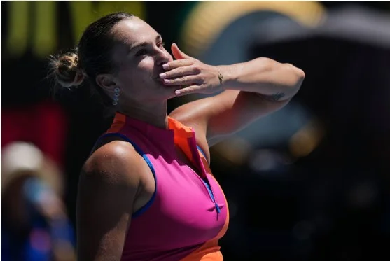 아리나 사발렌카(1위·벨라루스)가 27일(현지 시간) 호주 멜버른에서 열린 호주오픈 여자 단식 8강전에서 이바 조비치(27위·미국)를 물리친 후 손 키스를 날리고 있다. 사발렌카가 2-0(6-3 6-0)으로 승리하고 준결승에 올라 코코 고프(3위·미국)-엘리나 스비톨리나(12위·우크라이나) 승자와 맞붙는다.