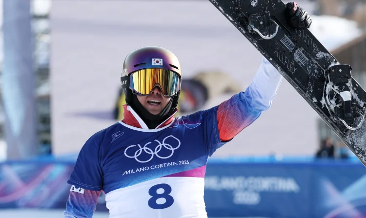스노보드 김상겸이 8일(현지 시간) 이탈리아 리비뇨 스노우파크에서 열린 2026 밀라노·코르티나 담페초 동계올림픽 스노보드 남자 평행대회전 결승에서 은메달을 차지한 뒤 기뻐하고 있다.