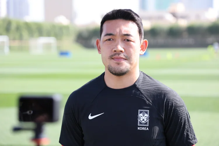 대한민국 축구대표팀 수비수 이기제가 13일(현지시간) 카타르 도하 알 에글라 트레이닝센터에 앞서 취재진 질문에 답하고 있다. 위르겐 클린스만 감독이 이끄는 대표팀은 오는 15일 E조 조별리그 첫 경기인 바레인전을 시작으로 20일 요르단, 25일 말레이시아와 경기를 치른다.