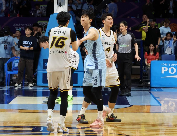 27일 오후 경기 고양시 고양소노아레나에서 열린 2025-2026시즌 LG전자 프로농구 4강 플레이오프 3차전 고양 소노와 창원 LG의 경기, 90-80 으로 승리한 소노 선수들과 패배한 LG 선수들이 서로 격려해주고 있다.프로농구 고양 소노가 '정규리그 챔피언' 창원 LG에 3연승을 거두고 창단 첫 챔피언결정전 진출을 달성했다.