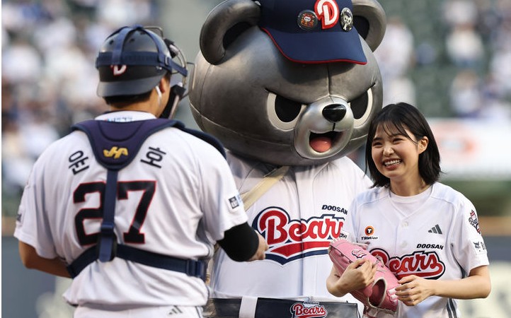 30일 서울 송파구 잠실야구장에서 열린 2026 KBO리그 삼성 라이온즈와 두산 베어스의 경기, 배우 최지수가 시구 후 공을 받고 있다.