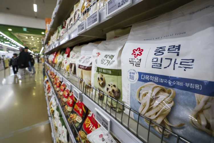 27일 서울 서초구 하나로마트 양재점에 밀가루가 진열되어 있다. CJ제일제당이 밀가루 제품 가격을 평균 5% 추가 인하한다고 밝혔다. 이는 올해 1월 초 업소용, 이달 초 소비자용 밀가루 가격을 각각 평균 4%, 5.5% 내린 데 이은 후속 조치다.공정거래위원회가 설탕에 이어 밀가루·전분당 등 식료품 담합에 대한 심의에 착수했다.