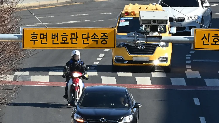 8일 경기도 수원시 한 도로에 설치된 후면 무인교통 단속 카메라 앞을 오토바이 운전자가 지나가고 있다. 경찰청은 오늘부터 뒷번호판을 찍는 후면 단속카메라를 활용해 이륜차 신호·과속 단속과 안전모 미착용을 무인 단속한다고 밝혔다.