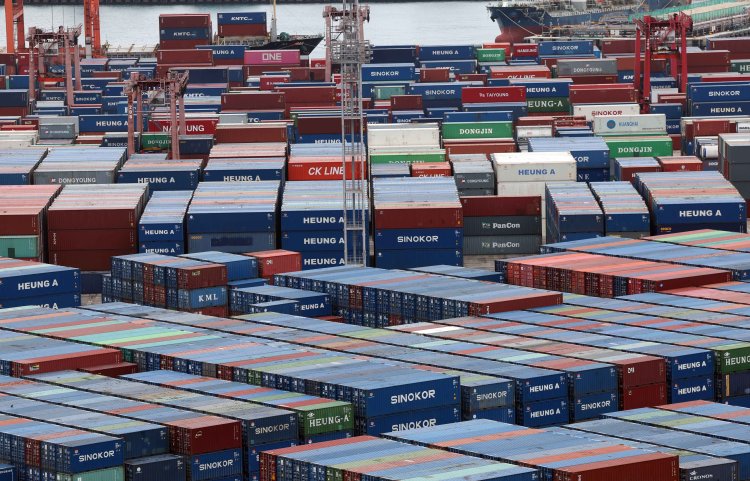산업통상부는 지난 2월 수출이 1년 전보다 29.0% 증가한 674억5000만 달러(97조5327억원)로 집계, 역대 2월 중 최대 실적을 기록했다고 1일 밝혔다. 이날 부산 남구 신선대 부두 야적장에 수출입 컨테이너가 쌓여 있다.