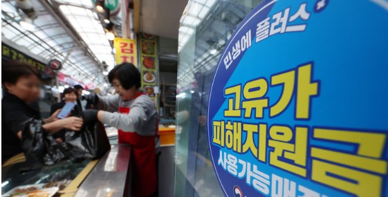 고유가 피해지원금 1차 지급이 시작된 27일 서울 강서구 남부골목시장 한 상점에 '고유가 피해지원금 사용 가능 매장' 스티커가 붙어 있다.차상위계층 등 취약계층을 대상으로 1인당 최대 60만원을 우선 지급하는 '고유가 피해지원금' 1차 신청이 사흘째를 맞은 가운데 29일 신청 대상자는 요일제 적용에 따라 출생연도 끝자리가 '3·8'인 국민이다.