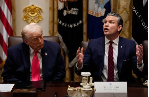 피트 헤그세스 미국 국방장관(오른쪽)이 지난해 12월2일(현지 시간) 미국 워싱턴DC 백악관에서 열린 내각 회의 중 도널드 트럼프 미국 대통령 옆에서 발언하고 있다