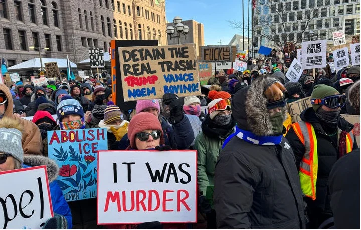 보수 정권인 도널드 트럼프 미국 행정부가 '총기 소지'를 이유로 시민권자 알렉스 제프리 프레티 사살을 정당화하면서, 총기 소지의 자유에 큰 의미를 부여하는 전통적 지지층이 동요하고 있다. 사진은 25일(현지 시간) 미네소타주 미니애폴리스에서 열린 알렉스 프레티 사살 항의 시위. 보수 정권인 도널드 트럼프 미국 행정부가 '총기 소지'를 이유로 시민권자 알렉스 제프리 프레티 사살을 정당화하면서, 총기 소지의 자유 보장에 큰 의미를 부여하는 전통적 지지층이 동요하고 있다.