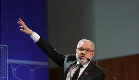 부패 혐의를 받는 헤르만 갈루셴코 우크라이나 전 장관이 15일(현지 시간)우크라이나에서 출국을 시도하다 당국에 체포됐다. 사진은 칼루셴코 전 장관이 재임시절이던 2023년 6월21일 영국 런던에서 열리는 회의에서 연설하는 모습.부패 혐의를 받는 우크라이나 전직 에너지 장관이 출국을 시도하다 당국에 체포됐다.