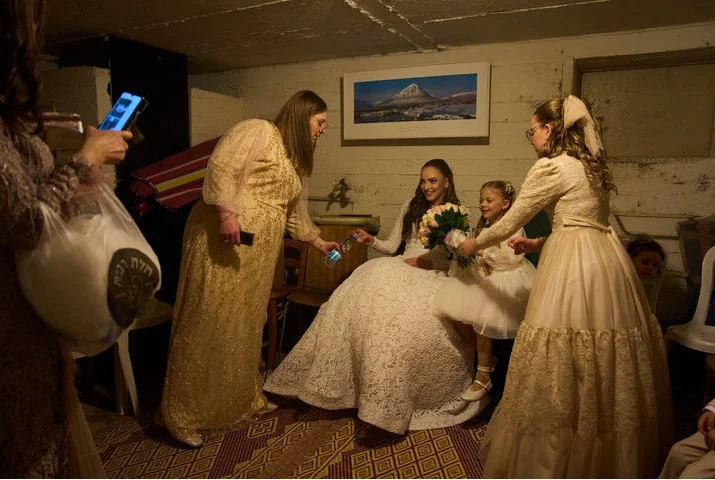 19일(현지 시간) 이스라엘 라마트간에서 결혼사진을 찍던 한 신부가 이란에서 발사된 미사일로 공습경보가 발령되자 가족과 함께 방공호로 대피해 머물고 있다.