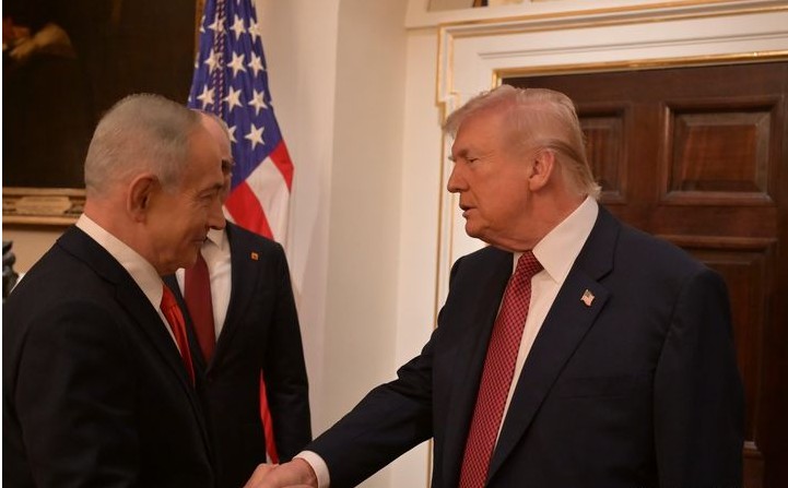 도널드 트럼프(오른쪽) 미국 대통령이 2월11일 백악관에서 베냐민 네타냐후 이스라엘 총리를 맞이하고 있다. 트럼프 대통령은 이스라엘군과 2월 28일 이란 폭격으로 전쟁을 시작했으며 전황이 교착상태에 빠지자 3월 21일 48시간내 호르무즈 해협의 봉쇄를 해제하라고 이란을 위협했다.