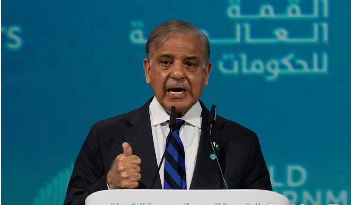셰바즈 샤리프 파키스탄 총리가 지난해 2월 11일 아랍에미리트(UAE) 두바이에서 열린 세계정부정상회의에서 연설하고 있다.파키스탄의 셰바즈 샤리프 총리는 8일 미국과 이란간의 휴전 협정 위반은 평화 프로세스의 정신을 훼손하는 것이라고 말하며 자제를 촉구했다.