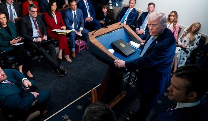 도널드 트럼프 미국 대통령이 6일(현지 시간) 백악관 브리핑룸에서 기자회견 중 취재진 질문에 답하고 있다이란 전쟁이 7일(미국 동부시간) ‘2주 휴전’ 합의로 파국을 면했지만 레바논이 휴전을 지속하는데 핵심 쟁점으로 떠오르고 있다.