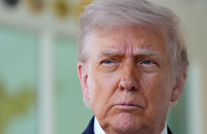 도널드 트럼프 미국 대통령이 13일(현지 시간) 백악관 집무실 밖에서 취재진 질문에 답하고 있다.