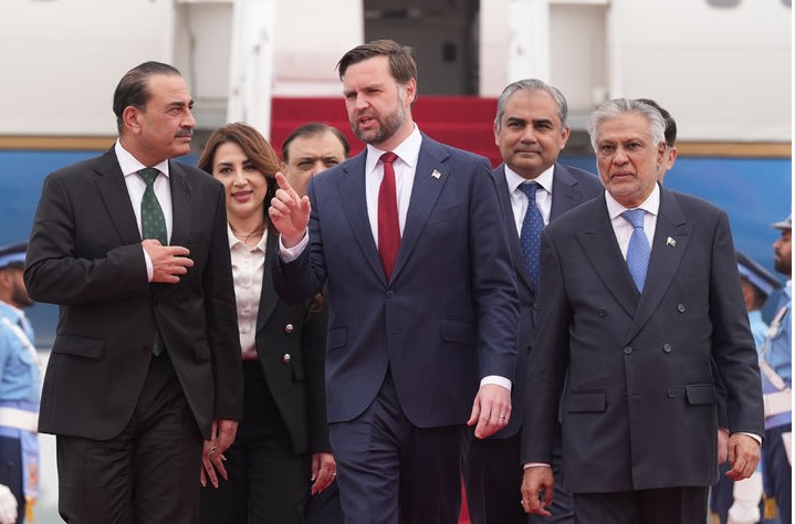 이란과 갖는 종전협상에 나선 JD 밴스(가운데) 미국 부통령이 11일(현지시간) 파키스탄 이슬라마바드 공항에 도착해 아심 무니르(왼쪽) 파키스탄 육군 참모총장과 이샤크 다르 파키스탄 부총리 겸 외교장관과 함께 걸어가고 있다