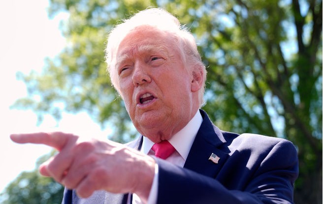 도널드 트럼프 미국 대통령이 16일(현지 시간) 백악관을 나서며 취재진 질문에 답하고 있다.