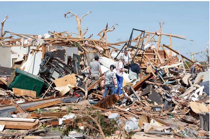 24일(현지 시간) 미 오클라호마주 이니드의 그레이리지에서 한 가족이 전날 발생한 토네이도로 파괴된 집 잔해를 살피고 있다.