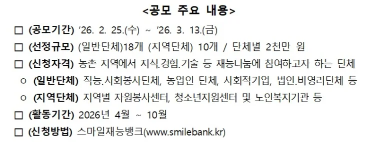 심사를 거쳐 최종 선정된 단체에는 최대 2천만 원의 활동비가 지원되며, 오는 4월부터 10월까지 전국 농촌 현장에서 재능 나눔 활동을 펼치게 된다.