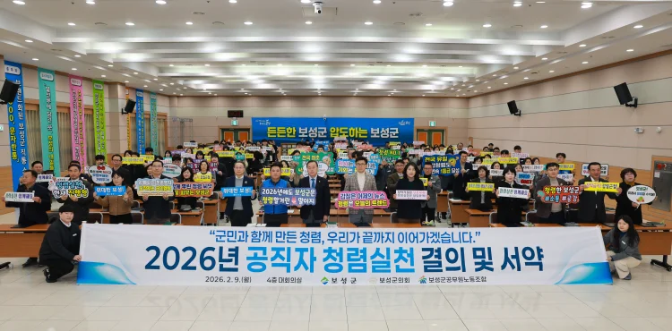 보성군, ‘청렴 실천 결의 및 서약식’ 개최로 청렴 문화 확산_보성군은 지난 9일 ‘2026년 반부패·청렴 실천 결의 및 서약식’을 개최했다 보성군은 지난 9일 보성군청 대회의실에서 보성군, 보성군의회, 보성군공무원노동조합이 공동 참여한 ‘2026년 반부패·청렴 실천 결의 및 서약식’을 개최했다고 밝혔다.