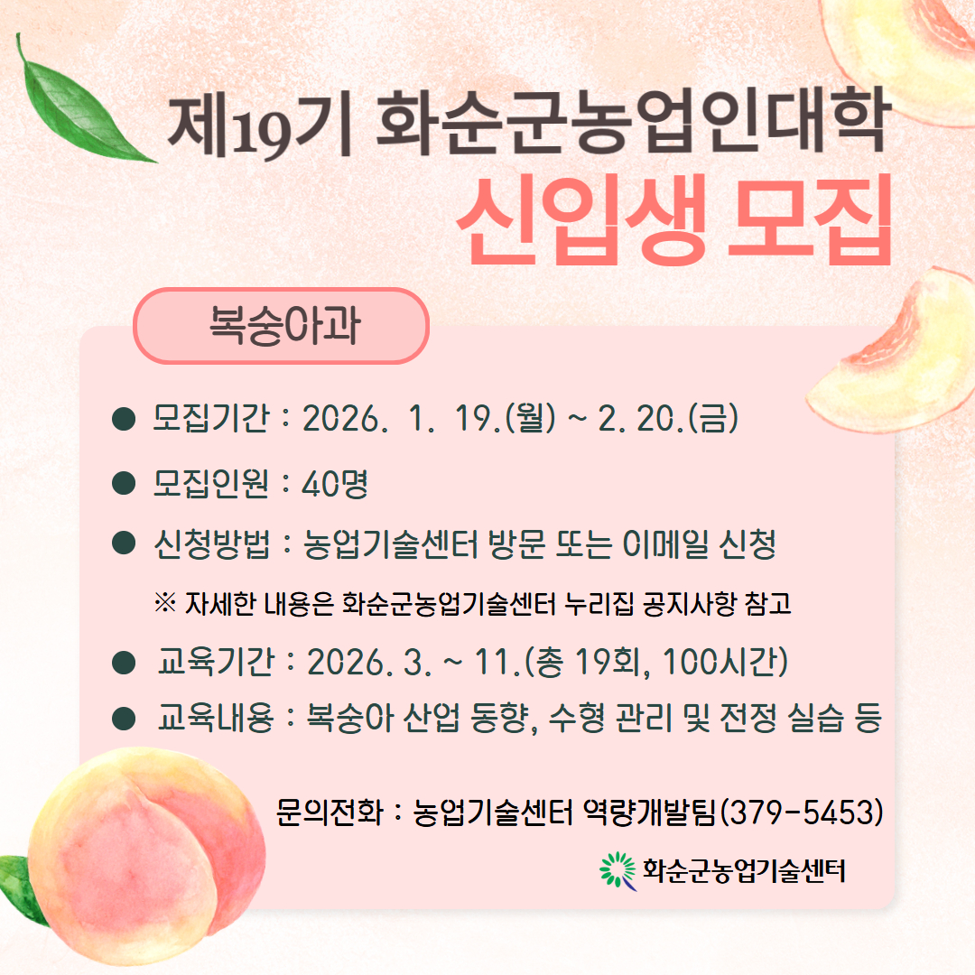 - 복숭아 단일 과정 운영, 1월 19일부터 2월 20일까지 신청 -