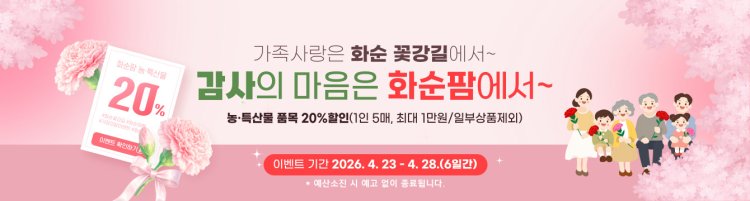 화순팜 가정의 달 감사의 달 이벤트 배너화순군(군수 구복규)은 다가오는 5월 가정의 달을 맞아 화순팜에서 오는 23일부터 4월 28일까지 다양한 이벤트를 진행한다고 밝혔다.