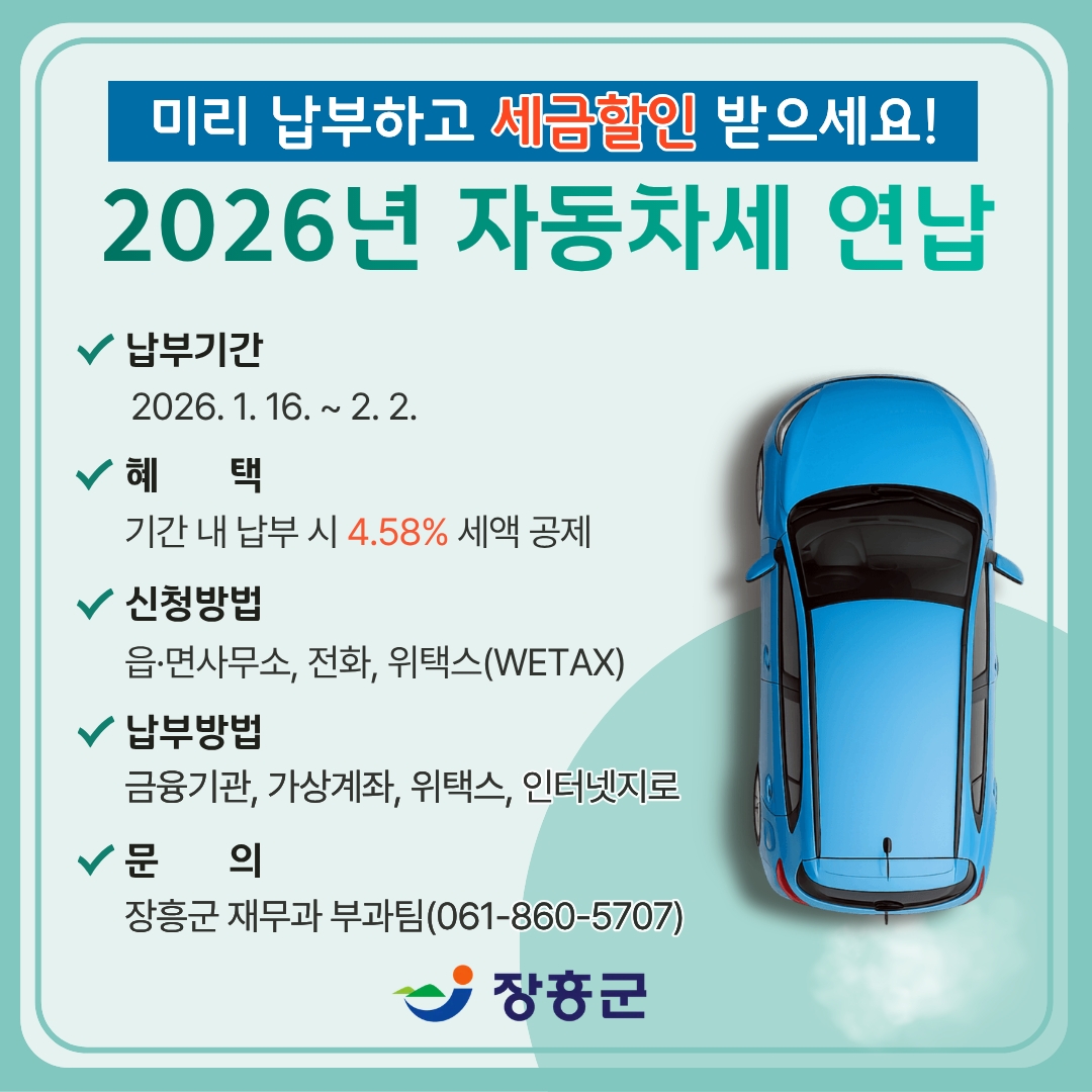 장흥군은 15일 2026년도 자동차세 연납 고지서를 장흥군에 등록된 모든 차량 소유자에게 일괄 발송했다고 밝혔다.