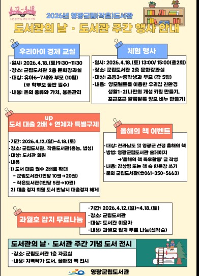 영광군은 오는 4월 12일부터‘도서관의 날(4.12.)’과 ‘제62회 도서관 주간’행사를 운영한다고 밝혔다.