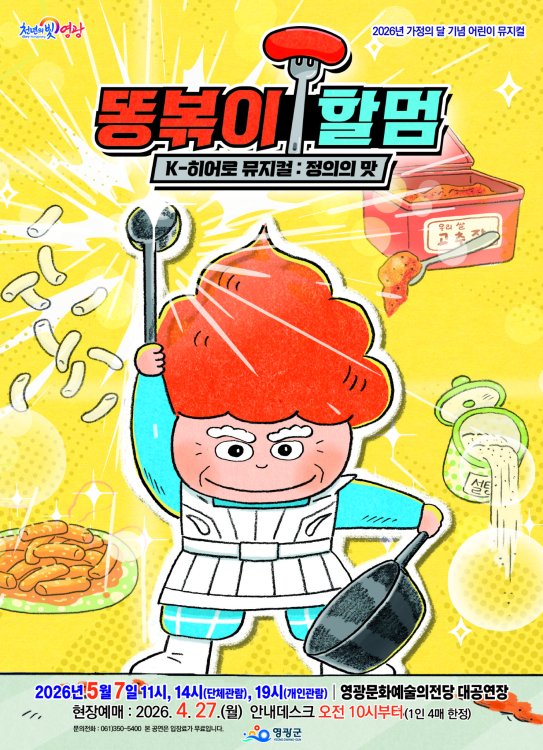 영광군은 오는 5월 7일(목) 오전 11시(단체관람), 오후 2시(단체관람), 7시에 영광문화예술의전당 대공연장에서 가정의 달 특집공연 웃음과 감동, 그리고 건강한 메시지를 전하는 이야기 ‘어린이뮤지컬 똥볶이 할멈’을 공연한다.