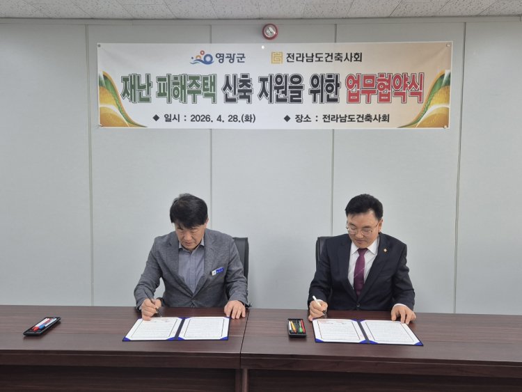 영광군은 전라남도건축사회와 지난 28일 ‘재난 피해 주택 신축 지원을 위한 업무협약’을 체결하고, 재난 피해 주민의 신속한 주거 안정 지원에 나서겠다고 밝혔다.