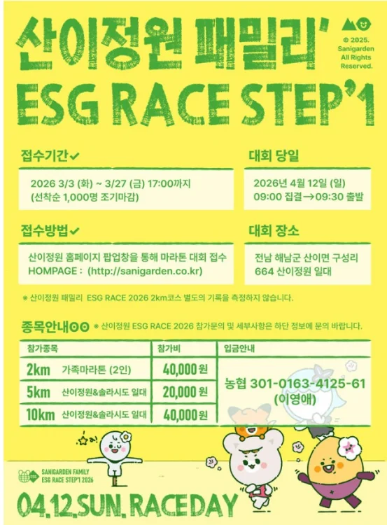 산이정원 관계자는 "이번 마라톤 대회는 자연과 정원을 배경으로 달리는 ESG 가치를 함께 실천하는 행사"라며 '봄꽃이 피어나는 정원 속에서 가족과 친구, 러너들이 함께 즐길 수 있는 특별한 경험이 될 것"이라고 말했다.