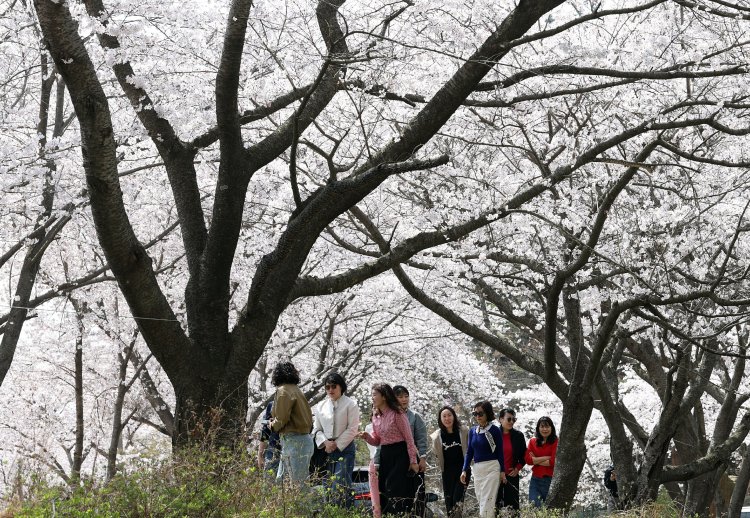 완연한 봄 날씨를 보인 지난 2일, 전남 강진군 금곡사 벚꽃길을 찾은 상춘객들이 맑은 하늘 아래 활짝 핀 벚꽃을 보며 봄나들이를 즐기고 있다.