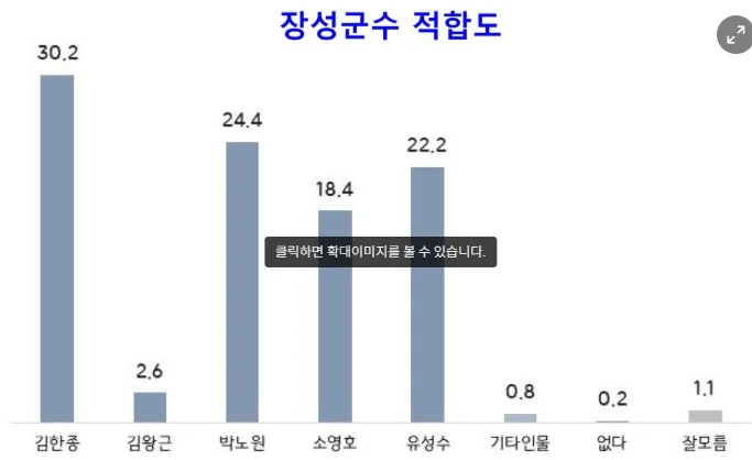 6월 3일 지방선거를 앞두고 실시된 장성군수 적합도 조사에서 김한종 현 장성군수가 30.2%로 1위를 기록했다.
