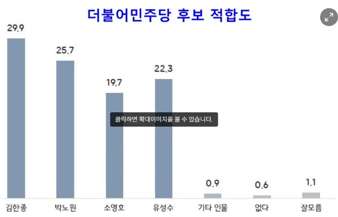 더불어민주당 장성군수 후보 적합도 조사에서도 김한종 군수가 29.9%로 가장 높았다. 박노원 전 행정관 25.7%, 유성수 부의장 22.3%, 소영호 전 부시장 19.7%가 뒤를 이었다.