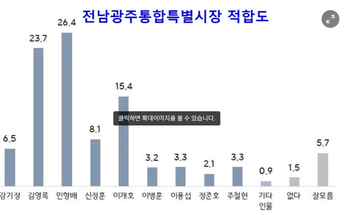 이번 조사에는 전남과 광주가 통합된 자치단체가 출범할 경우를 가정한 ‘초대 전남광주통합특별시장’ 적합도 문항도 포함됐다. 민형배 국회의원이 26.4%로 1위였고 김영록 전남도지사 23.7%, 이개호 전 농림축산식품부 장관 15.4%, 신정훈 국회의원 8.1%, 강기정 광주시장 6.5% 순으로 나타났다. ‘잘 모르겠다’는 응답은 5.7%, ‘없다’는 1.5%였다.