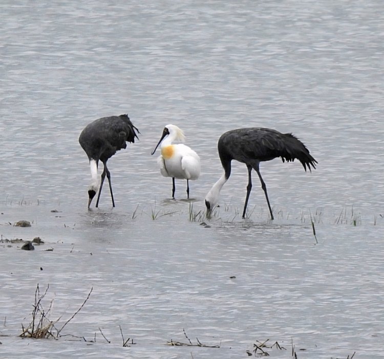 지난 20일 순천만 복원습지에서 겨울철새인 흑두루미 한 쌍과 여름철새인 저어새가 한 장면에 포착됐다