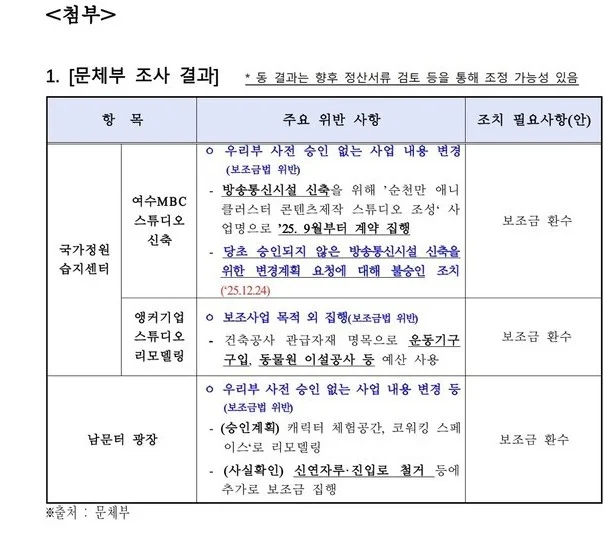 문체부 조사에 따르면 110억 원이 투입된 남문터광장 리모델링 사업에서 사전 승인 없이 진입로 철거 등 추가 공사를 진행하며 보조금을 불법 집행한 사실이 확인됐다. 전체 사업비의 절반이 넘는 218억여 원이 배정된 국가정원습지센터 관련 사업에서는 문체부 승인 없이 ‘스튜디오 신축’으로 사업 내용이 변경됐고, 이 과정에서 59억 원이 집행돼 보조금법 위반 지적을 받았다.