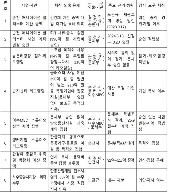 문화체육관광부의 특별조사로 순천시 애니메이션 클러스터 조성사업 전반에서 보조금법 위반 사례가 다수 확인되며 대규모 환수와 형사 조치 가능성이 제기됐다. 국회와 감사원, 특검 수사로까지 확대될 조짐을 보인다.