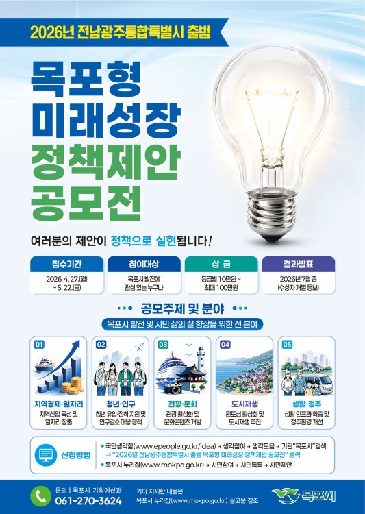 목포시가 전남·광주 통합특별시 출범에 대비하고 지역의 미래 성장동력을 발굴하기 위해 ‘목포형 미래성장 정책제안 공모전’을 개최한다.