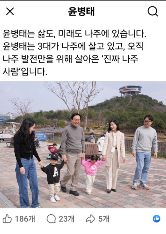 그러면서 "25년간 기획재정부와 정부 부처, 전남도 정무부지사로 일하며 나주 발전을 위해 뛰어왔다"며 "윤병태의 삶과 미래는 나주에 있다"고 말했다.