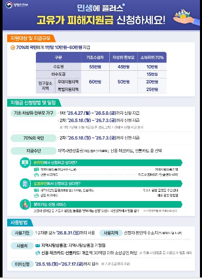 1차 지급은 4월 27일부터 5월 8일까지 진행되며 대상은 ▲기초생활수급자 ▲차상위계층 ▲한부모가족 등 취약계층이다. 지급 금액은 ▲기초생활수급자 60만 원 ▲차상위계층 및 한부모가족 50만 원이다.