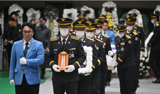 14일 오전 전남 완도군농어민문화체육센터에서 고(故) 박승원(44) 소방경과 고 노태영(30) 소방교의 영현 운구 행렬이 영결식을 마치고 빠져나가고 있다."같은 제복 입고 같은 현장 누비며 기쁨과 어려움 함께 나누던 동료여…."