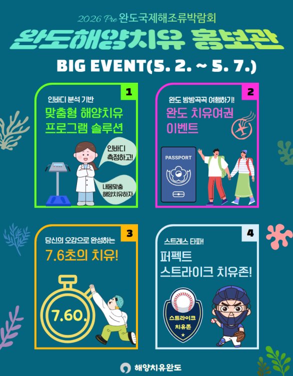 Pre 완도국제해조류박람회 기간 중 _완도 해양치유 홍보관_ 운영(이벤트 안내 이미지)‘2026 Pre 완도국제해조류박람회’ 개최 기간(5.2~5.7) 동안 완도만의 해양치유 콘텐츠를 선보이는 ‘해양치유 홍보관’을 운영한다.
