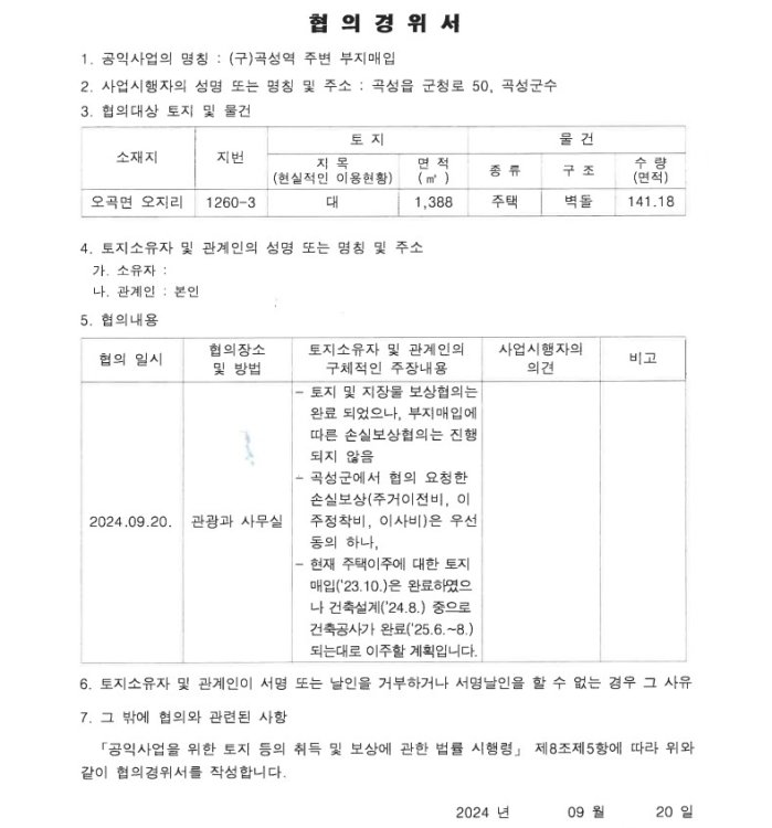 이에 대해 곡성군은 구 곡성역 주변부지 매입사업 추진 과정에서 2023년 8월 토지 및 지장물에 대한 손실보상 협의를 체결했으며, 이후 주거이전비와 이주정착비, 이사비 등 잔여 보상 항목에 대한 협의를 거쳐 2025년 8월 최종 지급이 완료됐다고 설명했다.
