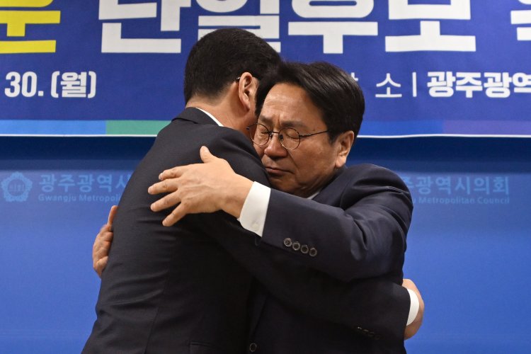 더불어민주당 전남광주통합특별시장 본경선 주자인 강기정(오른쪽) 예비후보가 30일 오전 광주 서구 광주시의회에서 열린 신정훈 예비후보와의 단일화 후보 확정 회견을 마치고 신 후보를 안고 있다. 더불어민주당 전남광주통합특별시장 경선 참여로 시장 직무정지 상태인 강기정 예비후보가 1일 "시장 복귀는 경선이 끝난 뒤 하겠다"고 밝혔다.