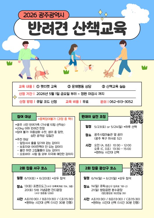 이번 교육은 20㎏ 이하 중·소형견만 가능하며 5월1일부터 광주시 누리집 카드뉴스에 게재된 포스터의 정보무늬(QR)코드를 통해 온라인 신청하면 된다.