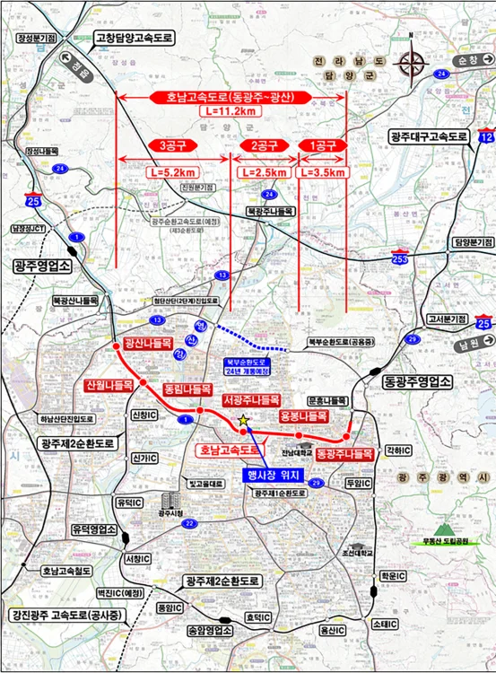 호남고속도로 동광주IC~광산IC 구간 확장 공사. (사진=광주시청 제공). 호남고속도로 확장공사는 총 7934억원을 투입해 동광주IC부터 광산IC까지 총 11.2㎞ 구간을 기존 왕복 4차로에서 6차로로 확장하는 사업이다.