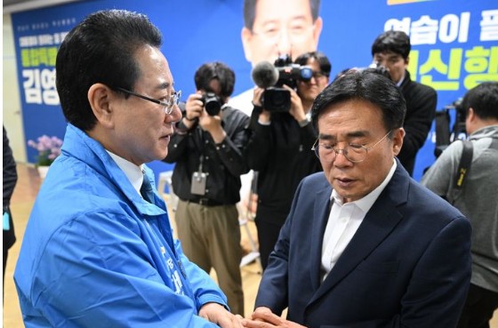 더불어민주당 전남광주통합특별시장 결선 발표 날인 14일 오후 광주 서구 광천동 김영록 후보 캠프에서 김 후보(왼쪽)가 결선 패배 후 이병훈 총괄상임선대위원장과 이야기를 나누고 있다 더불어민주당 전남광주통합특별시장 경선에서 간발의 차로 고배를 마신 김영록 전남지사가 경선 과정에서 발생한 2300여 통에 이르는 'ARS 먹통사태'를 문제삼아 중앙당에 경선 전면 재조사를 요구했다.