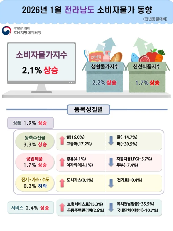 전남 1월 소비자물가지수는 전년동월대비 2.1% 상승했다. 전국 평균보다는 웃돌았다.