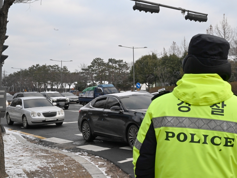 이틀새 광주·전남에 최고 25㎝ 눈이 쌓이는 등 한파가 찾아온 12일 오전 광주 서구 치평동 한국은행 사거리에서 경찰이 차량을 인솔하고 있다
