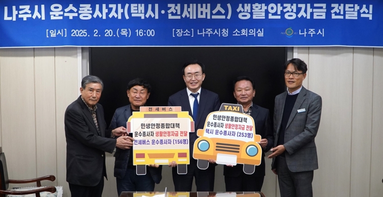 나주시나주시가 연료비 상승과 승객 감소로 어려움을 겪는 택시, 전세버스 운수종사자의 생계 안정을 위해 1인당 20만원의 생활안정자금을 지급했다. 윤병태 시장과 운수업계 대표자들이 전달식 기념사진을 찍고 있다. (사진제공-나주시)