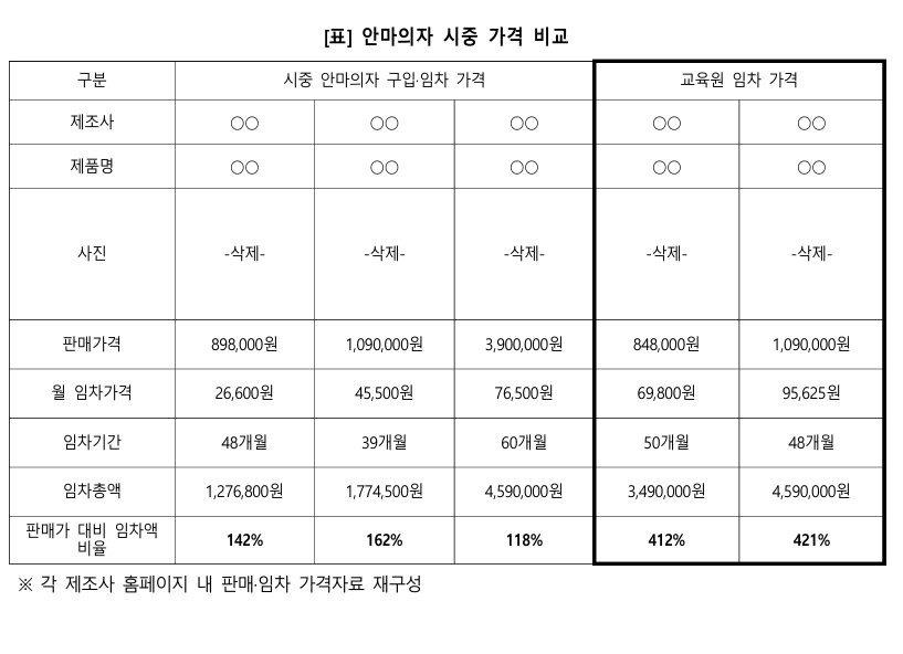 국립재난안전교육원은 휴게실 안마의자 대여 과정에서 가격 조사를 소홀히 해 700만 원 넘게 낭비했다. 직원 A씨는 2023년 10월 가전 렌탈업체 B사와 안마의자 2대를 50개월간 월 13만9600원, 총 698만 원에 계약했다. 그러나 공식 판매가는 169만6000원으로, 임차비의 4분의 1 수준이었다. 제조사 렌탈 기준(월 5만3200원, 총 255만3600원)과 비교해도 2.5배 비쌌다. 12월 당직실용 안마의자 1대 계약(월 9만5625원, 총 459만 원) 역시 판매가(109만 원)보다 4배, 제조사 대여가(월 4만5500원, 총 177만4500원)보다 2.5배 높았다. 행안부는 A씨에게 경고를 내리고 계약 해지를 지시했다.